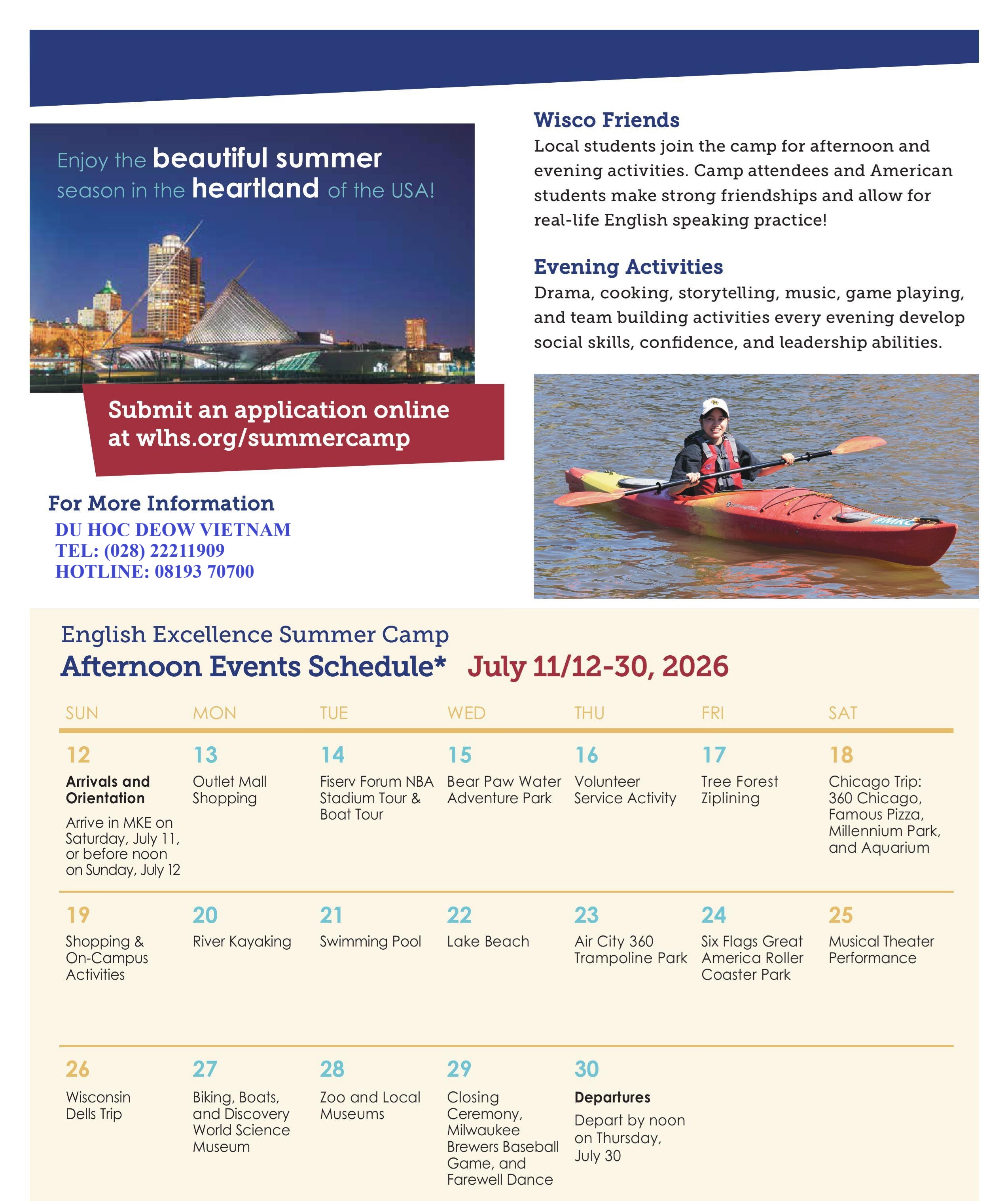 Học sinh địa phương tham gia trại hè vào các hoạt động buổi chiều và buổi tối. Học sinh tham gia trại hè và học sinh Mỹ tạo dựng tình bạn bền chặt và có cơ hội thực hành nói tiếng Anh trong đời thực!