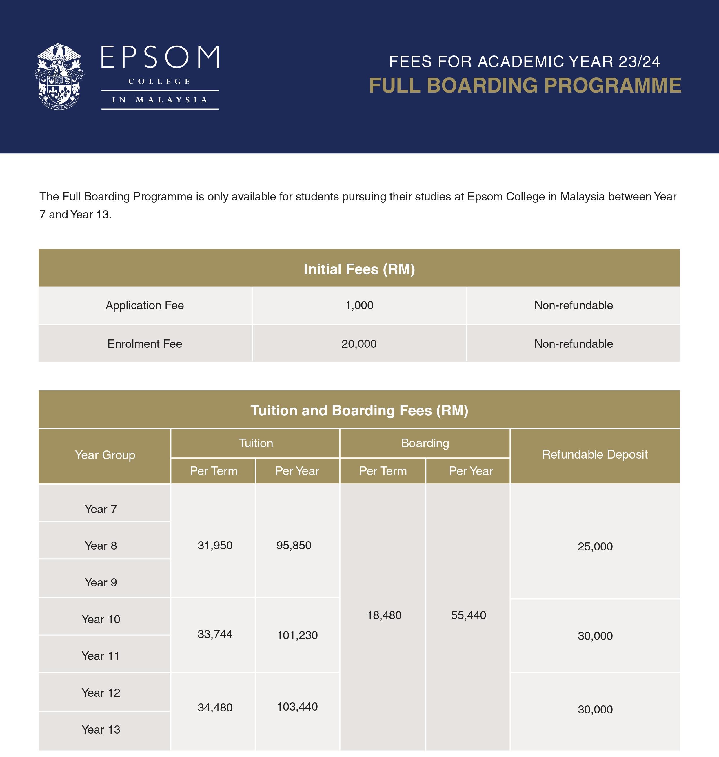Phí đăng ký Tiền đặt cọc được hoàn lại Học phí & Phí nội trú Ghi chú Epsom có 3 học kỳ trong một năm, bắt đầu từ tháng 9 đến tháng 7. TỶ GIÁ MALAYSIAN RINGGIT (Tháng 12/2024): 1 RINGGIT = 5,700 Vietnam Dong. Phí đăng ký: 1,000 RM ~ 5.479.000 Vietnam đồng Phí nhập học: 20,000 RM ~ 109.580.000 Vietnam dong Học phí, ăn ở (55,440 RM) tổng cộng cho các Nhóm lớp: Lớp 7-9: ước tính 151,290 RM ~ 828,917,910 VND/ năm (3 terms/kỳ trong năm) Lớp 10-11: ước tính 156,670 RM ~ 858,394,930 VND (3 terms/kỳ trong năm) Lớp 12-13: ước tính 158,880 RM ~ 870,503,520 VND (3 terms/kỳ trong năm) |