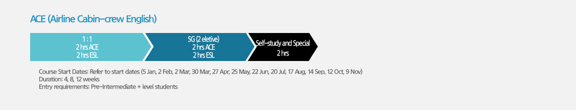 ESL, IELTS, TOEIC, ACE, TESOL, Expresser, Power Speaking, Business course, Family course. Đặc biệt, CELLA là trường anh ngữ duy nhất tại Philippines có khoá học Tiếng Anh Phỏng vấn dành cho Tiếp viên hàng không, ACE. CELLA là đối tác của ANC Học Viện đào tạo tiếp viên hàng không tại Hàn Quốc, phối hợp với trường CELLA thiết kế khoá học ACE để luyện tập cho kỳ phỏng vấn tiếp viên hàng không cho học sinh.
