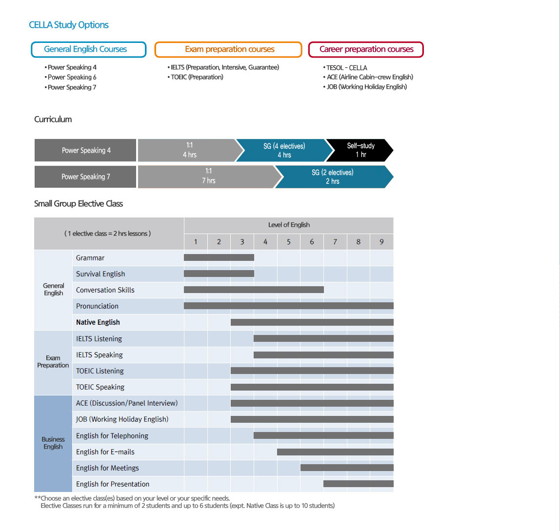 Các môn học tại CELLA Premium được tổ chức theo ý nguyện học viên, do đó rất phù hợp cho những bạn muốn tập trung vào những lĩnh vực cụ thể hay tập trung vào cải thiện những điểm yếu. Thế mạnh của trường là luyện Nói chuyên sâu trong thời gian ngắn rất thích hợp cho những học viên không sắp xếp được nhiều thời gian học tập tại Philippines, bởi vì thay vì học một ngày 4 - 5 tiết 1:1 mỗi ngày như tại một số trường khác thì tại CELLA Premium học viên được học đến 6 tiết 1:1 mỗi ngày.