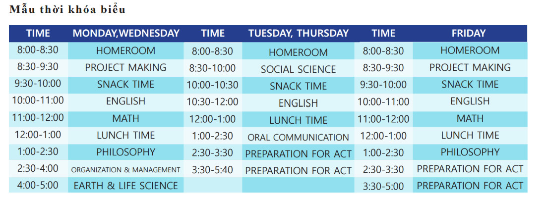 * Người nước ngoài sẽ học tiếng Anh để chuẩn bị cho kỳ thi đại học ACT trong tiết học FILIPINO (tiếng Philippines).