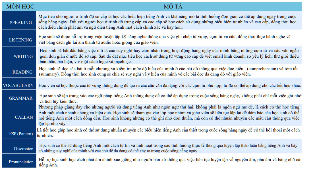 » Chương trình học không chỉ đơn thuần sử dụng giáo trình về giao tiếp, chúng tôi biên soạn giáo trình đa dạng theo từng cấp độ, lấy trọng tâm nội dung trong sách giáo khoa của Mỹ, từ tiếng Anh cơ bản đến nâng cao.